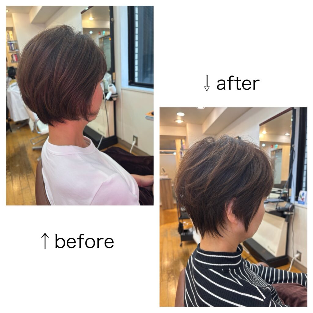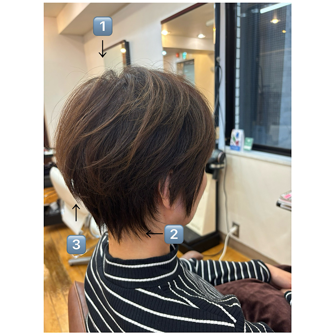 1️⃣トップを短く切り、ふんわりとした空気感がでます。