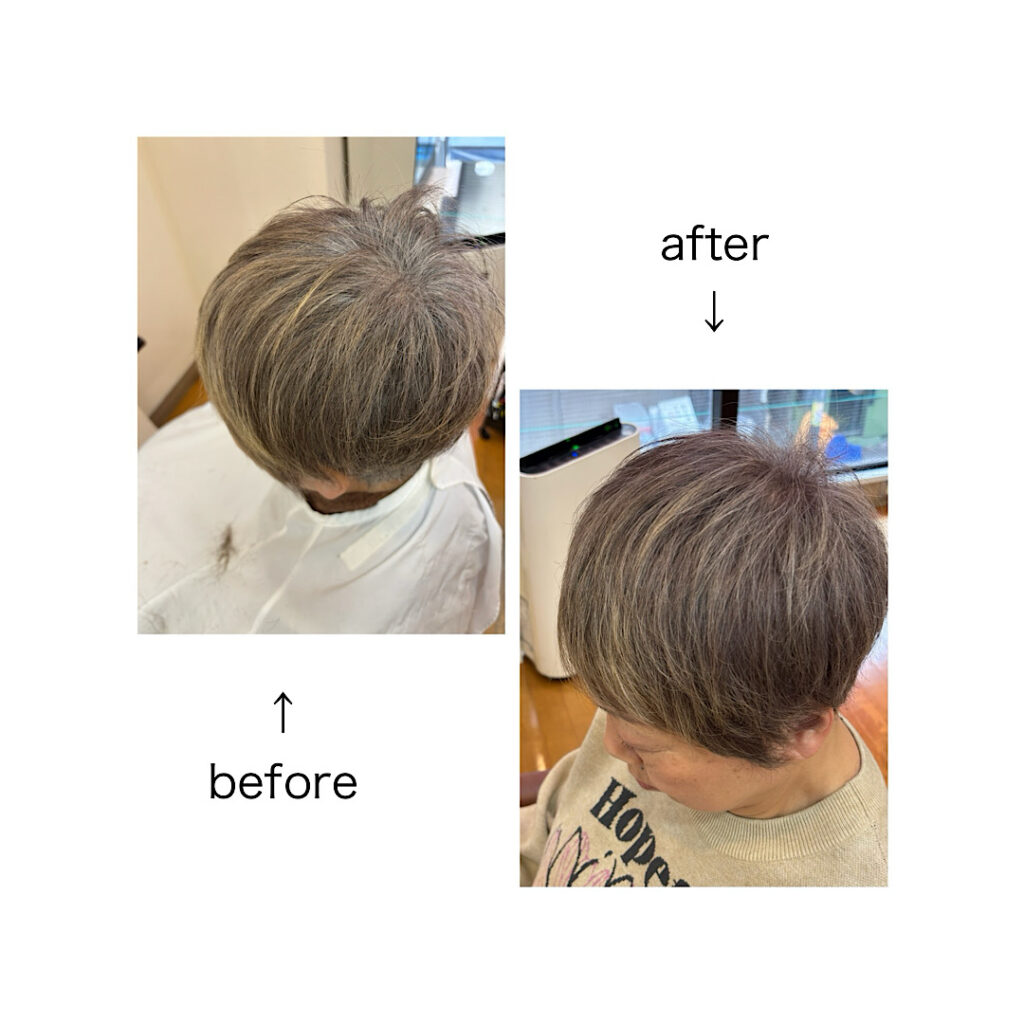 明るめのカラー剤を使うことにより、根元が伸びてきた時に自然に白髪とつながるグラデーション効果が期待できます!
