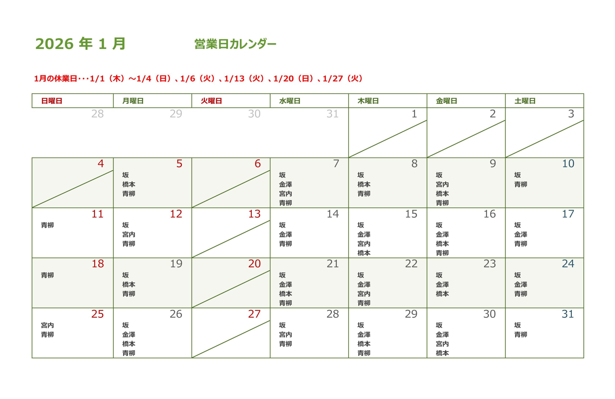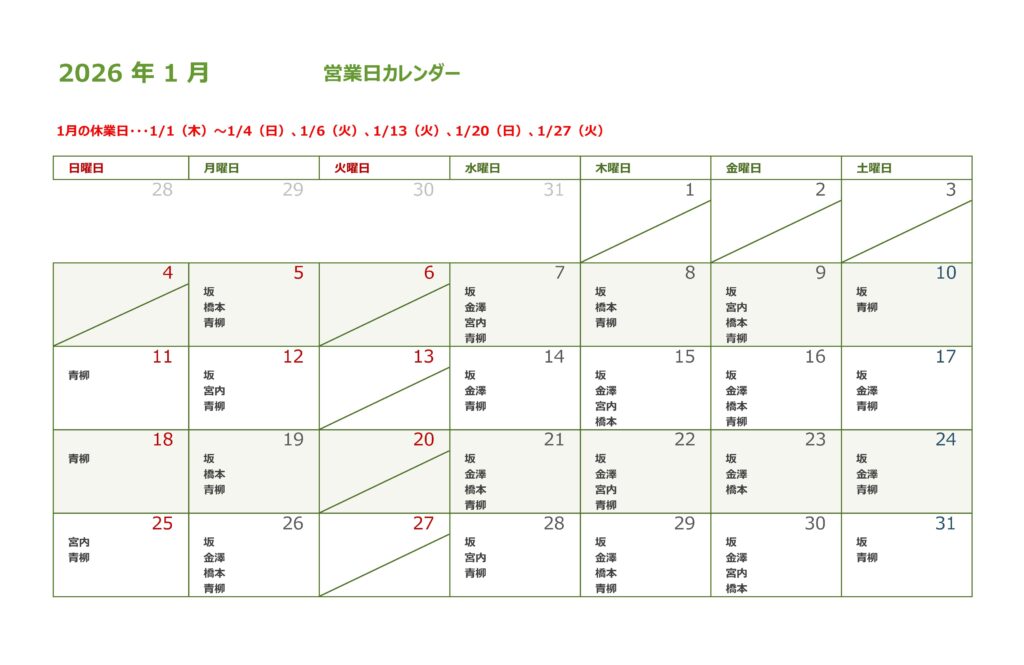 ★2026年1月の営業日・スタッフ出勤日カレンダーです★