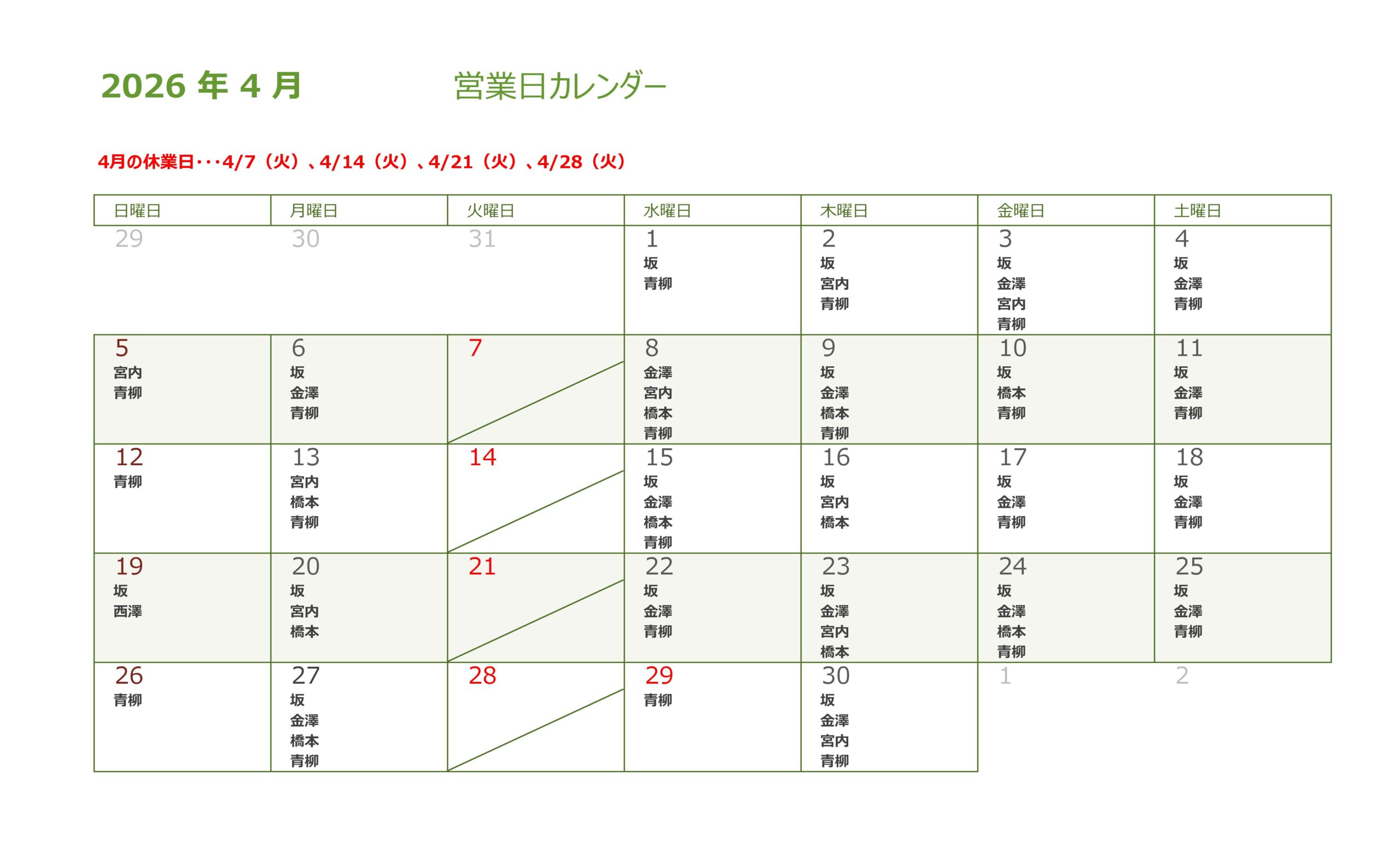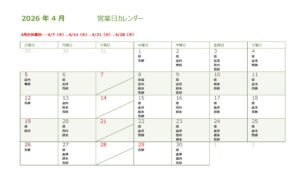 ★2026年4月の営業日・スタッフ出勤日カレンダーです★