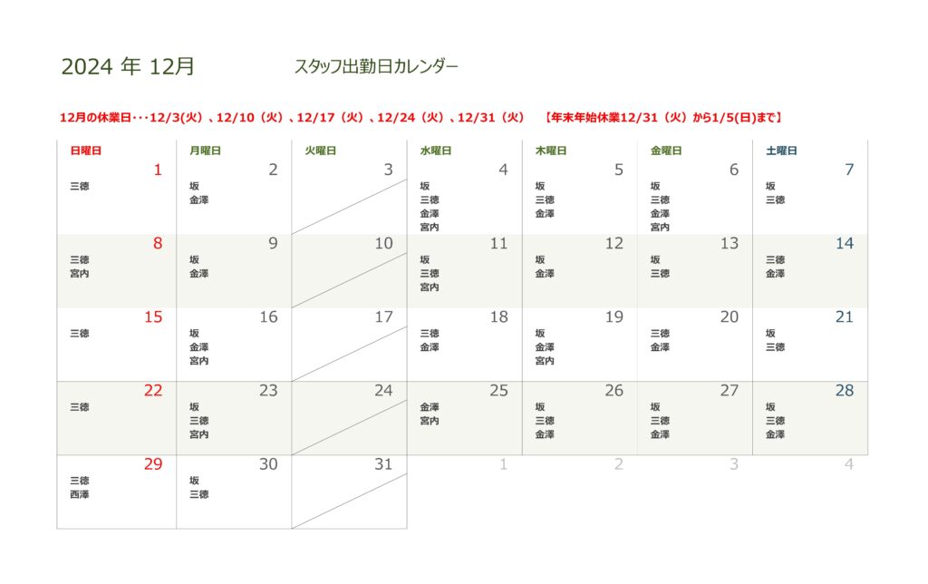 ★2024年12月の営業日・スタッフ出勤日カレンダーです★